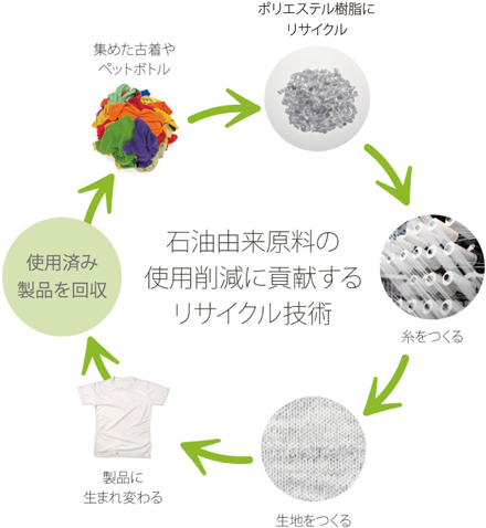 衣料品に含まれるポリエステル繊維を溶かし出し、精製して、もう一度ポリエステル繊維の原料であるポリエステル(PET)樹脂を製造するケミカルリサイクルの技術開発に成功しました。この技術で、衣料品に使われる石油資源の使用量を減らしていくことを目指します。
