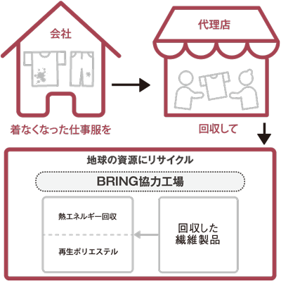 アイトス社の取り組み協力により、BRING TM(商標表記)の仕組みを活用しユニフォームを廃棄処分するのではなく、費用0円で資源として活用しませんか?