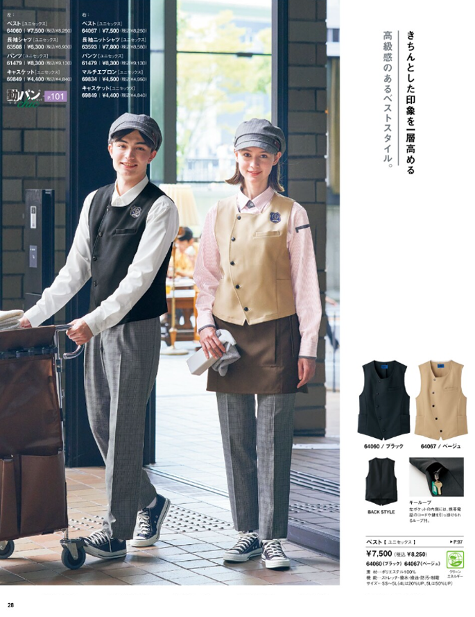時代にあわせて進化し続けるスカイビルをイメージしたファッシ ョナブルなデザインで、多くのお客様から好評を頂いております。作業道具を入れるのに便利な前掛けや吸汗速乾に優れたシャツなど、使い手を考えた機能でスタッフたちのモチベーションも自然とアップしています。