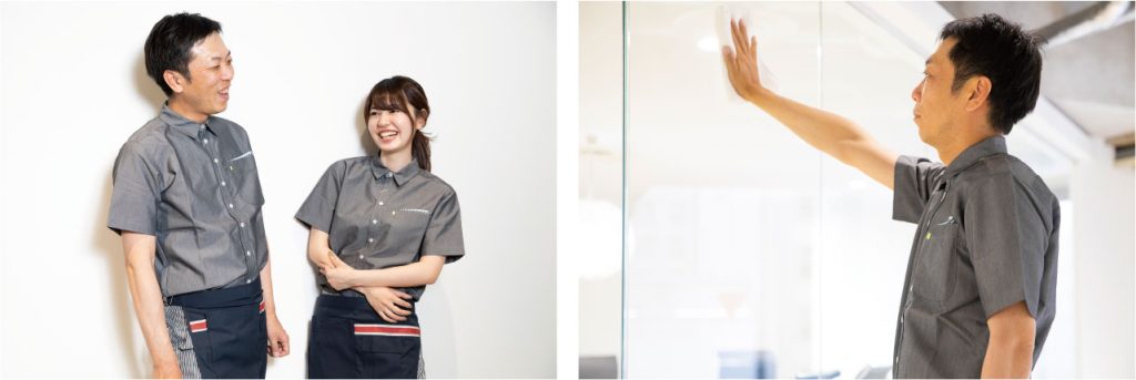 時代にあわせて進化し続けるスカイビルをイメージしたファッショナブルなデザインで、多くのお客様から好評を頂いております。作業道具を入れるのに便利な前掛けや吸汗速乾に優れたシャツなど、使い手を考えた機能でスタッフたちのモチベーションも自然とアップしています。