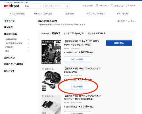 ログインして、『購入履歴』でレビューしたい商品の『レビュー投稿』ボタンを押してレビューを投稿・送信ください。