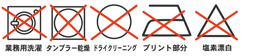 プリントは熱に弱いため、リネンサプライヤーによる業務用洗濯をおこなった場合、短期間でプリントが剥離してしまいます。業務用洗濯をお使いのお客様には、洗濯耐久性や加工消耗度などを考慮した上で、刺繍加工をおすすめしております。また、避けるべき洗濯方法によりプリントが剥離した場合、弊社としては一切の責任を負いかねます。