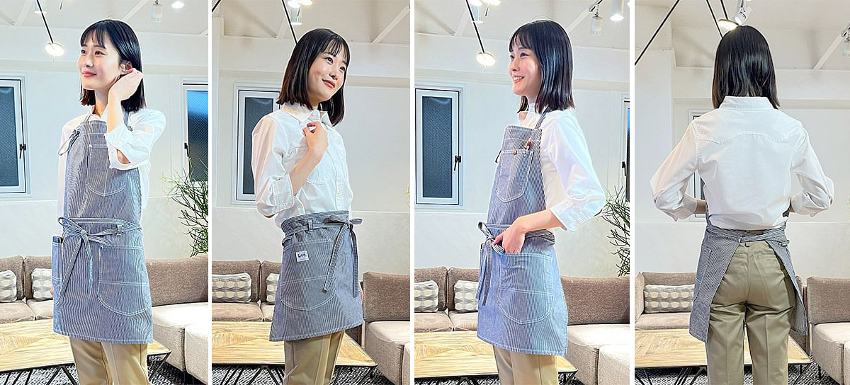 前後のヨークデザインが特徴の七分袖ウエスタンシャツと1枚のエプロンで胸当てタイプと前掛けタイプで着こなしを楽しめる人気の2Wayエプロンをコーディネート。Leeらしいハードさを保ちつつも、繊細なステッチワークで現代のオシャレなデザインを追求。