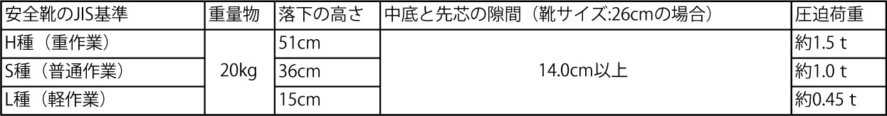 - 圧迫性能:つま先に重量物が押しつけられても、規定以上の隙間を確保してつま先を守れる