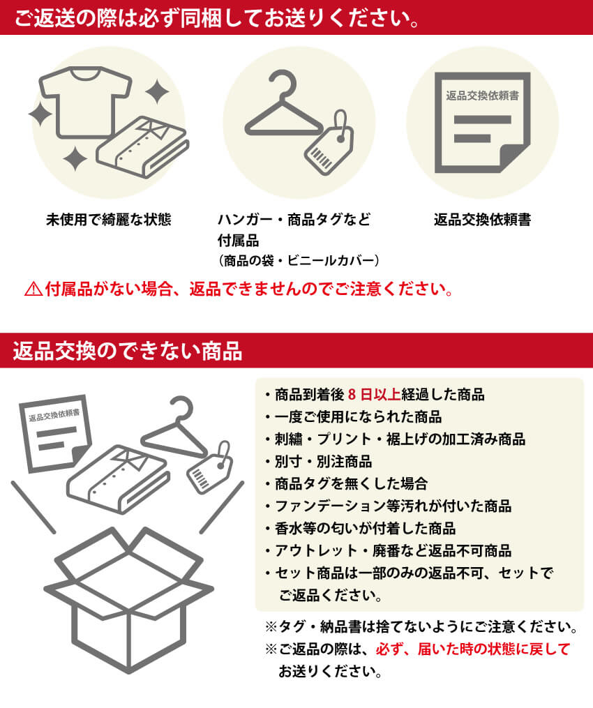 (通常の返品・交換については、お電話等は不要です。同梱の返品交換依頼書をお使いください)